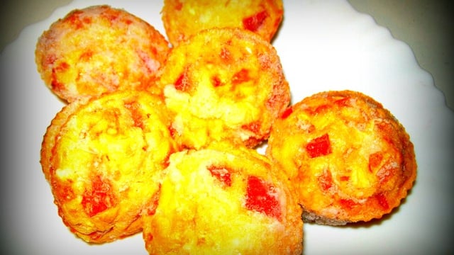 Saler et poivrer. Ajouter à l'appareil le chèvre coupé en petits morceaux et les poivrons.