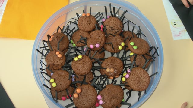 Une fois les muffins refroidis, ajouter 8 pattes avec des bandes de papier noir pliées que vous insérez délicatement dans le gâteau. Puis coller 2 pastilles chocolatées à l'aide de pâte à tartiner pour faire les yeux. Bonne dégustation !