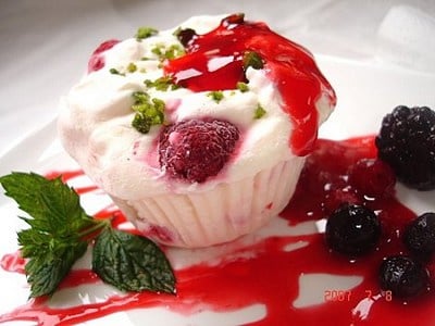 Prendre les 150gr,et y ajouter de la gelée de groseilles fondue au micro onde, ensuite mixer le toutMettre un muffin sur une assiette,enlever le papier, et verser un peu de coulis et quelques fruits mélangés congelés