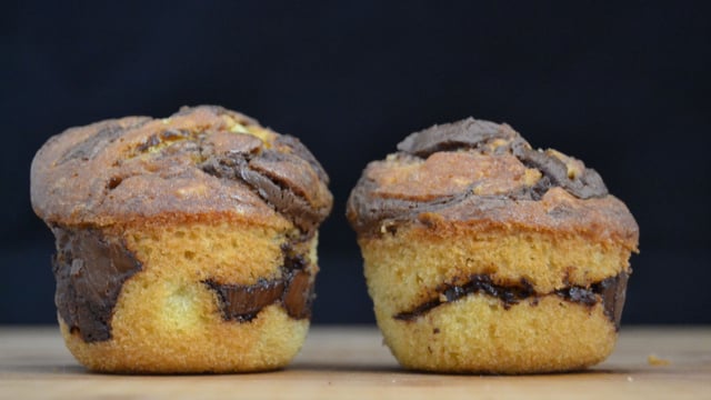 Verser un peu de pâte à muffins dans les empreintes à muffin. Passer le Nutella quelques secondes au micro-ondes pour le fondre légèrement. Ajouter ensuite une cuillère de Nutella dans les empreintes et recouvrir de pâte à muffins.