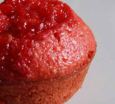 Au dessus enfoncez à peine une fraise tagada®, c'est ce qui donne sa couleur rose vif et caramélisé au dessus du muffin.