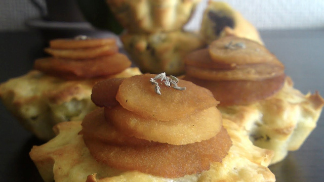 Pendant la cuisson des muffins, lavez, épluchez et coupez la pomme en fines rondelles (ou lamelles) et faites les cuire à la poêle avec un peu d'eau. Une fois cuites, retirez les du feux et disposez les sur les muffins. Vous pouvez ajoutez quelques feuilles de thym. A dégustez bien chaud!