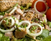 Vous voulez servir une salade parfumée à vos invités ? Cette entrée à base de museau de porc devrait régaler tous les amateurs de charcuterie. Pour donner du goût à votre salade, vous allez faire une vinaigrette maison. Tout d'abord, vous allez mélanger de l'huile, du vinaigre et de la moutarde. Ensuite, vous allez rajouter du persil haché, une branche de cèleri mais aussi de thym, des rondelles d'oignons, quelques clous de girofle et des feuilles de laurier à cette sauce. Enfin, à la dernière minute, vous allez donner une touche croquante en parsemant des câpres sur vos morceaux de museau de porc. Si vous n'en avez pas, vous pouvez les remplacer par des cornichons coupés en rondelles. C'est un délice !