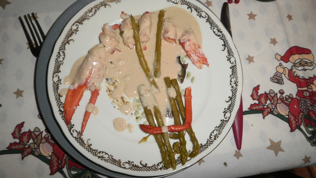 dressez vos assiettes des médaillons et de 4 ou 5 asperges tièdes. Mettre au chaud (pas trop car il y a un risque que le homard se déssèche).