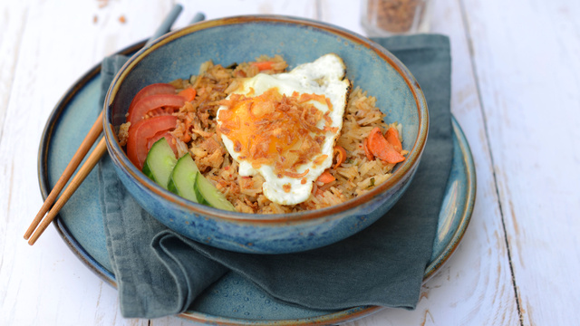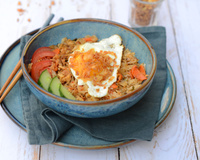 Le Nasi Goreng est un plat très populaire en Indonésie et en Malaisie. Son nom signifie "Riz frit". Il peut être agrémenté de diverses protéines comme de l'œuf, du poulet ou des crevettes. Nous avons fait ici une version sans viande.