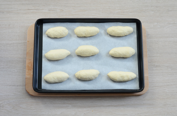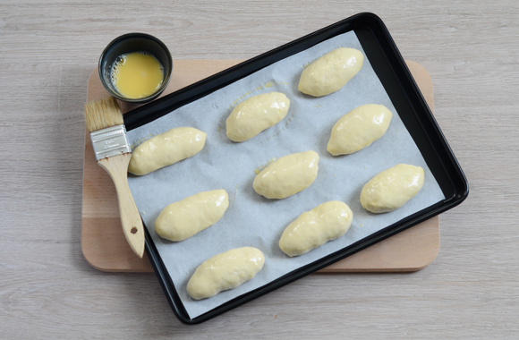 2Faites des pâtons de 40 g chacun et façonnez-les en petits pains longs. Humidifiez les navettes avec un pinceau souple légèrement humide, et laissez-les pousser à température ambiante pendant 1 heure environ.