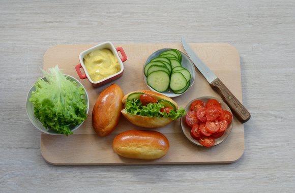 5Mettez une feuille de batavia à l'intérieur de la navette puis ajoutez quelques rondelles de concombre et de tomate.