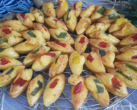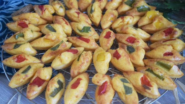 Verser dans les moules (j'ai 2 moules et fait 2 fournées). Déposer sur chaque navette, un morceau de poivron et enfourner pour 10 minutes. Sortir et laisser refroidir sur une grille. Bon Apéro !!!