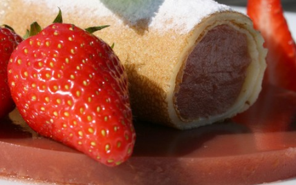 Démouler les cylindres de pulpe de fraise et rouler dans la crêpe.