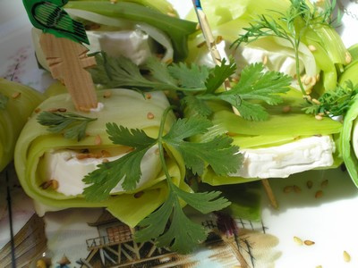 Roulez les feuilles de poireaux et piquez les d'un pique en bois pour les maintenir.