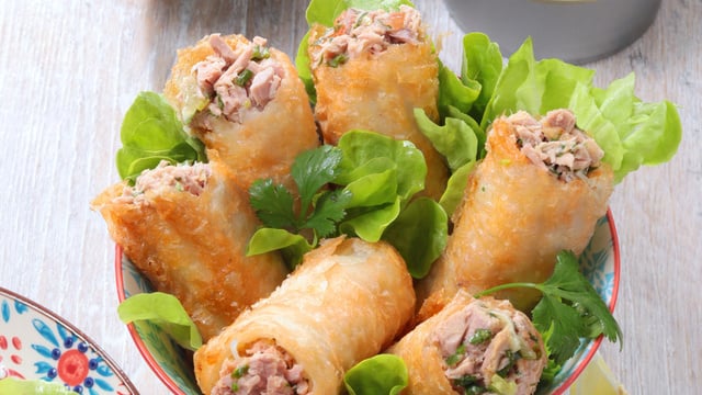 Plonger les nems par groupe de quatre dans le bain de friture à 170°, laisser dorer 2 à 3 min environ puis les déposer sur du papier absorbant.Servir aussitôt les nems avec de belles feuilles de salade, de la coriandre fraîche et la sauce Chermoula.