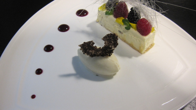 Au moment de l'envoi disposer dans une assiette triangulaire avec une quenelle de sorbet yaourt.