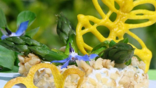 Fondant de roquefort légèrement pané de noix servi avec de petites asperges croquantes et avec un papillon croustillant au curry, le tout accompagné d'une salade arrosée d'une vinaigrette acidulée au Xérès et à l'huile de noix.