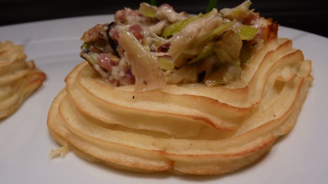 Cette recette s adapte a volonté suivant la purée (vitelotte, carottes, ...) et la garniture (saumon, autres légumes, autre fromage...)