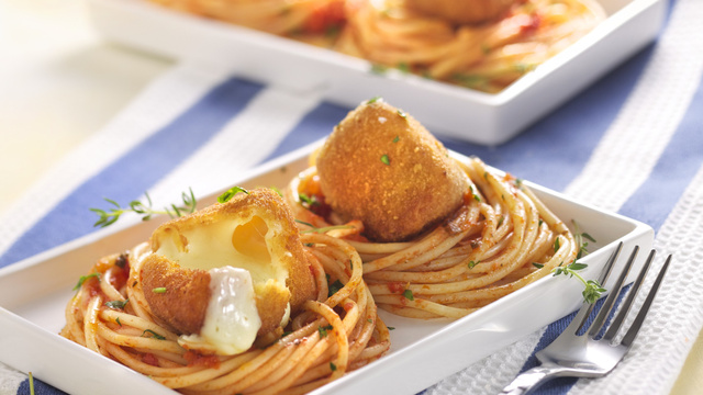 En même temps, faire cuire les Spaghetti dans un gros volume d’eau bouillante salée pendant 8 min. Les égoutter et mélanger à la sauce Napoletana réchauffée.