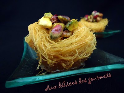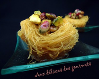 Ce nid d'oiseaux connu aussi sous le nom de'aush elbulbul' est une pâtisserie orientale d'origine syrienne, constituée de cheveux d'anges enroulés sous forme d'un nid, arrosés de sirop parfumé à la fleur d'oranger et garni de pistaches.
