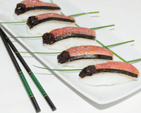 Les déposer sur le côté des filets. Poser au bout de chaque nigiri une pointe de confit d'olives.