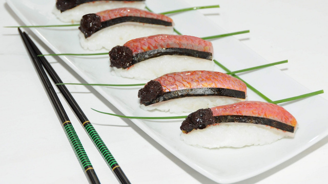 Prendre une cuillerée à soupe de riz dans le creux de la main en le pressant légèrement pour lui donner une forme de rectangle aux bords arrondis. Étaler un soupçon de wasabi sur la chair d'un filet de rouget. Poser le filet de rouget côté chair sur le boudin de riz, peau au dessus.