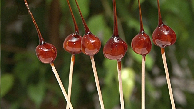 Trempez les noisettes dans le caramel, plantez les piques dans la plaque de polystyrène, noisettes vers le bas. Retirez le cure-dents et utilisez les noisettes caramélisées pour décorer vos desserts.