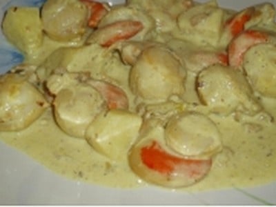 Ajouter les noix de Saint-Jacques dans la crème au curry et laisser mijoter 4 minutes environ.
