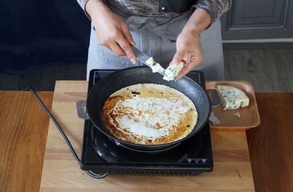 4Aoutez la crème liquide et la fourme d'Ambert émiettée.