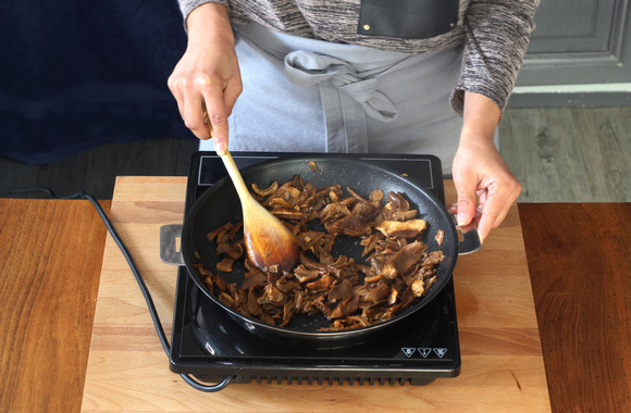 Faites chauffer une poêle sur feu vif, saisissez les champignons avec 30 g de beurre pendant 2 min. en remuant constamment. Baissez le feu, couvrez et laissez cuire jusqu’à ce qu’ils soient juste tendres. Salez, poivrez et réservez au chaud dans un bol.