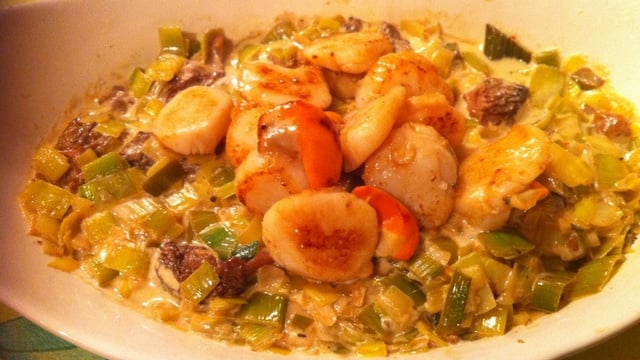 Ne sachant pas comment cuisiner mes noix de St-jacques, je me suis souvenu de mon velouté de poireaux aux morilles et je me suis dit que ce mariage était tellement bon que marié avec mes saint-jacques ce devrait être parfait.