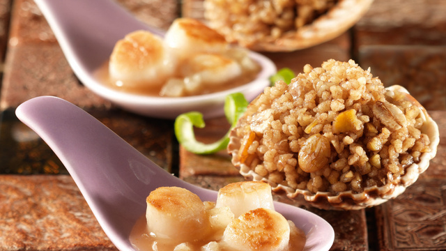 Déposez les morceaux de poires dans la poêle afin de les enrober du mélange. Faites revenir rapidement (1 min. de chaque côté) les noix de Saint-Jacques dans une autre poêle avec un peu de matière grasse. Ajoutez-y la sauce aux poires puis servez le tout accompagné des Céréales Gourmandes.