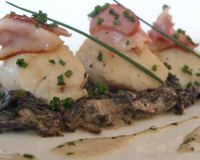 Dresser dans les assiettes en commencant par les trompettes, disposer dessus les noix de Saint-Jacques, surmonter ces dernières de tranches de lard fumé.