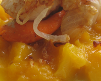 Dressez aussitôt vos assiettes en déposant de la compoté de mangues bien chaude puis 2 noix et terminez par les oignons frits .