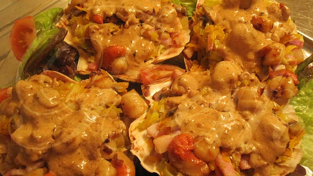 Dans une autre poêle, faite revenir l'échalote dans un peu de beurre, mélanger bien et additionner les noix de St. Jacques le vin et la béchamel, laisser mijoter environ 5 minutes, retirez du feu et versez sur les légumes qui se trouve dans le coquillage. Servez aussitôt. Bon Appétit !