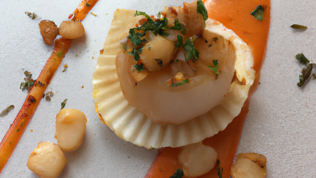 - Les étuvés avec un peu de beurre, sel et un soupçon de sucre semoule.- Couvrir avec une feuille de papier sulfurisé.Dressage :Au centre on met la julienne de légumes, au tour on y dispose les St-Jacques et les arroser avec un peu de sauce.Avant de dresser, faire chauffer la sauce, ajouter une noissette de beurre et mettre les noix de St-Jacques laisser environ 2 minutes (sur feu doux).