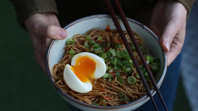 Servez les nouilles, ajoutez l’oeuf mollet.