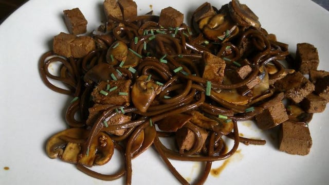 Faire dorer le tofu puis ajouter les champignons. Faire cuire les nouilles selon le mode d'emploi, en général 3 min.