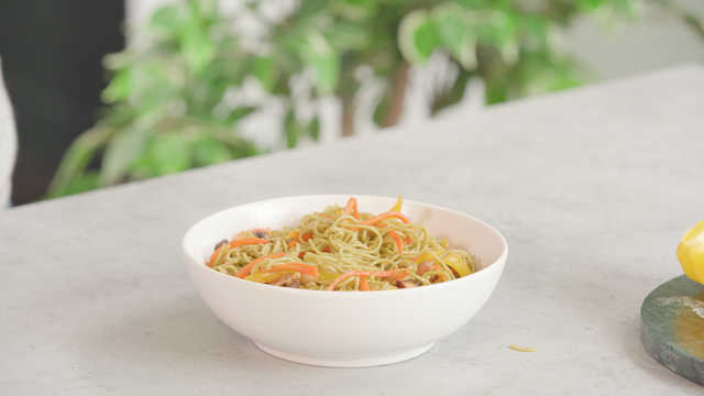 Dans cette version des nouilles sautées les nouilles sont au blé et à l'algue wakamé. Ce qui donne cette jolie couleur aux nouilles, mais est aussi source de calcium.