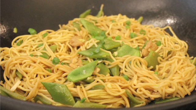 Faites chauffer le wok, ajoutez l'huile, baissez à feu moyen, puis faites revenir le porc. Ajoutez l'ail haché, le gingembre en lamelles et le blanc de l'oignon ciselé. Ajoutez les haricots, mélangez, ajoutez les sauces soja et remuez bien. Ajoutez de l'eau pour couvrir les haricots, une fois à ébullition, ajoutez les nouilles sans mélanger. Couvrez et laissez cuire 5 minutes. Ajoutez le vert de l'oignon et terminez par un filet d'huile de sésame.