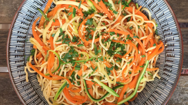 Ajoutez dans le wok la julienne de courgettes et faite-la revenir 1 minute, juste pour l’attendrir. Ajoutez 12 cuillères à café de sauce soja, mélangez puis versez dans un bol.