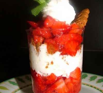 Dans 4 coupes (ici j'ai utiliser des verres à pied en plastique) répartir un peu de fraises, napper d'une couche de chantilly, puis saupoudre de poudre de spéculoos (8 spéculoos mixés)