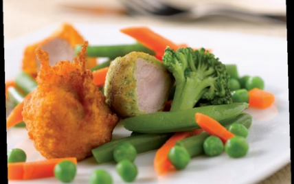 Enrobez chaque morceau de veau dans la farine, puis trempez-les dans le mélange purée, oeuf, farine. Faites les revenir dans une poêle pendant 2 minutes par face.Pendant ce temps, faites cuire la poêlée de légumes à la vapeur le temps indiqué sur le sachet. Dressez les nuggets et les légumes dans une assiette. Servez.