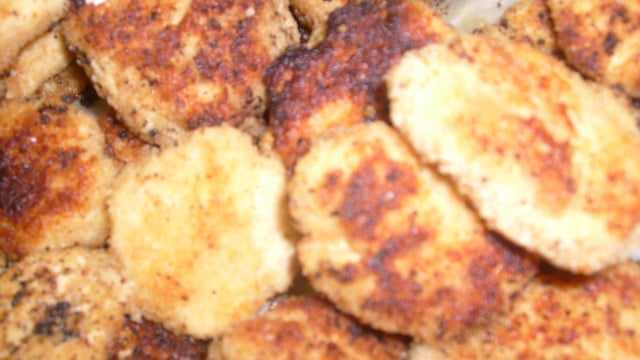 Former des petits pâtés avec deux cuillères. Les tremper ensuite dans les jaunes d'oeuf battu avec de l'eau puis dans la chapelure.