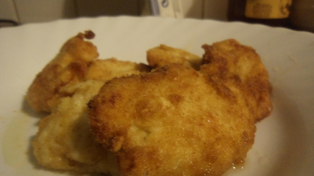 Faire des petites boules avec ce mélange. Les rouler dans l'oeuf puis dans la chapelure (ou biscotte mixer). Faire chauffer de l'huile dans une poêle, une fois chaude mettre les nuggets à cuire.