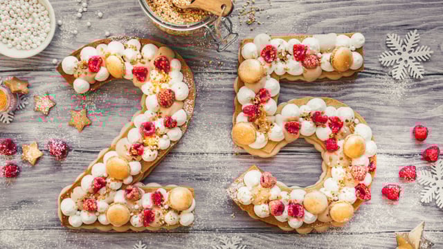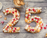 Étalez les pâtes entre deux feuilles de papier sulfurisé. Détaillez les chiffres à l’aide des gabarits fournis. Roulez le reste de la pâte en boule, étalez à nouveau et détaillez les deux chiffres restants (il faut en tout 2 fois le chiffre 2 et deux fois le chiffres 5). Réservez au frais sur deux plaques à pâtisserie recouverte de papier sulfurisé puis enfournez pour 20 minutes. Laissez refroidir.