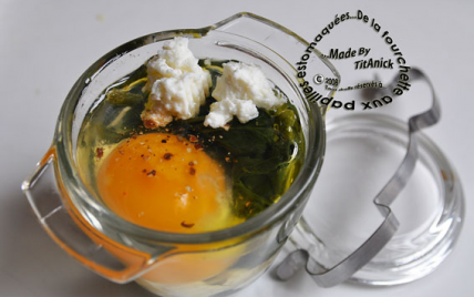 Déposez les épinards précuits dans le fond du cuit oeuf huilé. Ajoutez la moitié du brocciu. Cassez l'oeuf dans le cuit-oeuf. Déposez le reste du bruccio. Versez un filet d'huile d'olive. Salez et poivrez. Refermez et déposez dans l'eau bouillonnante d'une casserole sans que l'eau ne dépasse le joint du couvercle.