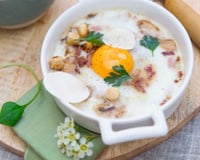 Verser le blanc d’œuf dans la cassolette mélanger avec les lardons et les champignons puis laisser cuire lentement à feu doux.