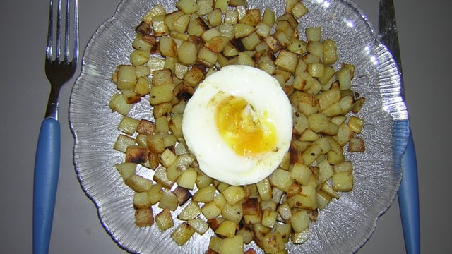 Lorsque les pommes de terres commencent à avoir l'air d'être cuite, il faut les saler et les poivrer. Puis, prendre une autre poêle, la faire chauffer, la graisser et y casser autant d'oeuf que de personnes à nourrir...