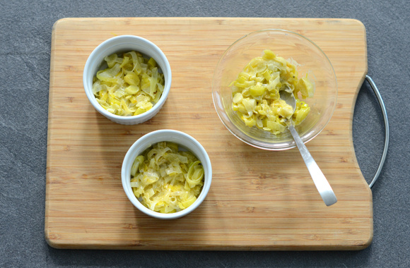 Mettez 2 cuillères à soupe de fondue de poireaux dans chaque ramequin.