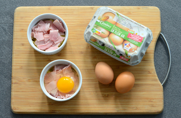 7Cassez 1 œuf dans chaque ramequin en prenant soin de ne pas crever le jaune.