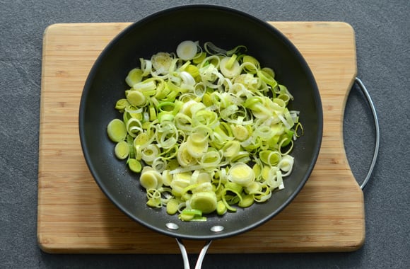 2Dans une poêle, chauffez 1 cuillère à soupe d'huile d’olive puis ajoutez les poireaux. Salez et poivrez.