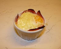 Couper la tranche de jambon en deux et poser chaque demi tranche au fond du ramequin ou du bol en croix.