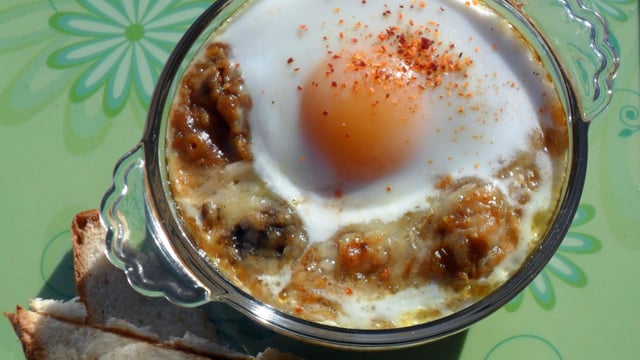 Cassez un oeuf dessus et faites cuire environ 5 minutes de plus.
